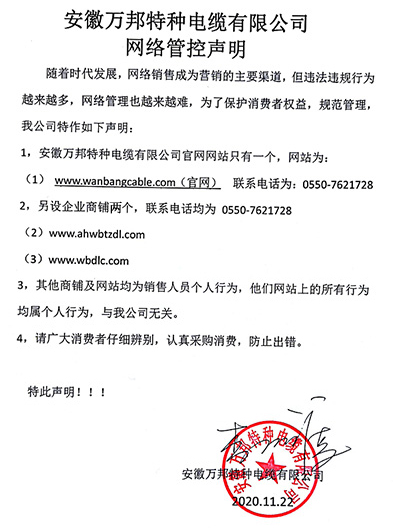 鄭重聲明:安徽萬邦特種電纜有限公司官方網站為:www_wanbangcable_com.xhrjscg.cn,除此之外無任何子網站或合作網站,其余均為假冒偽劣。電話:0550-7621728 13485756353 地 址:安徽省天長市滁州高新技術產業開發區經四路29號